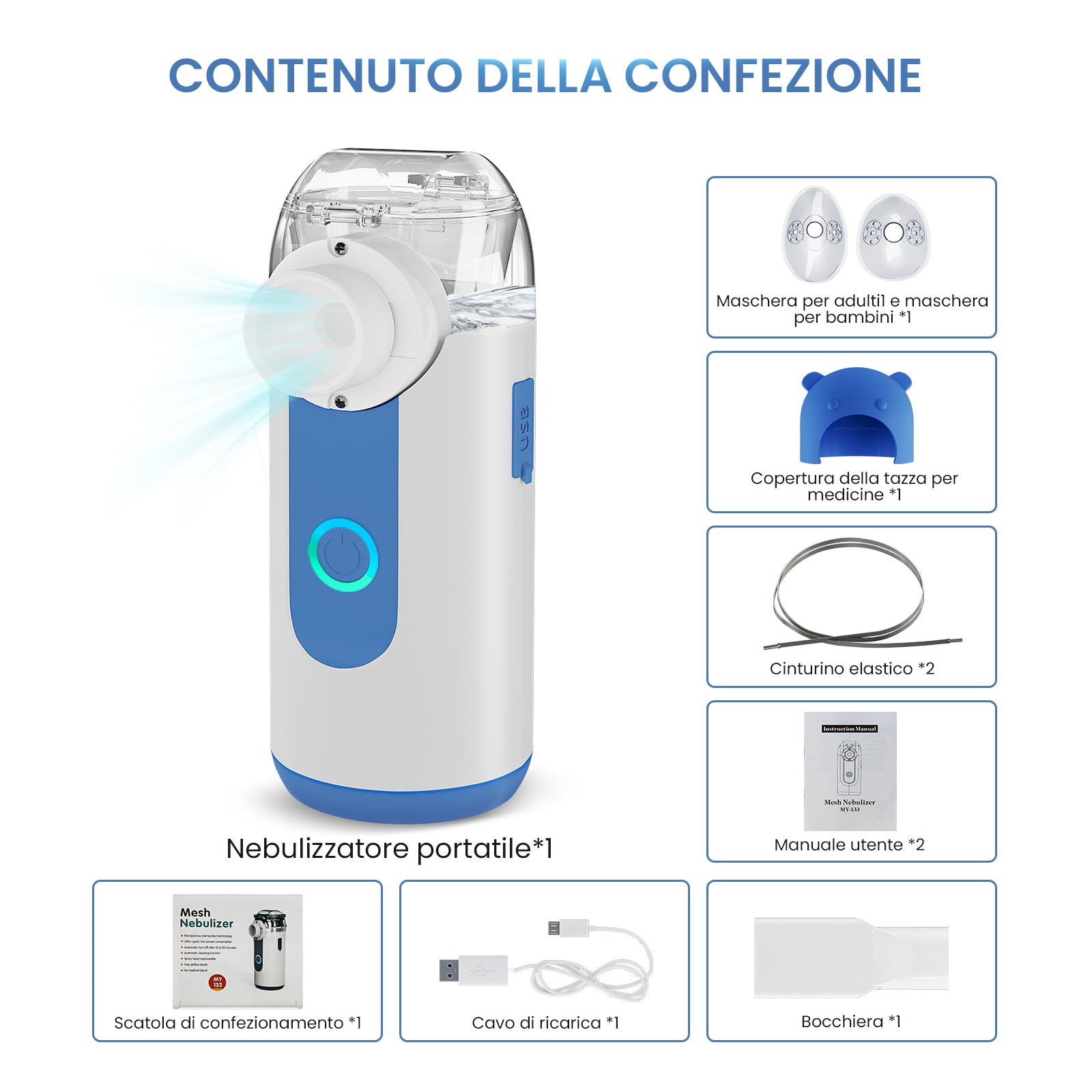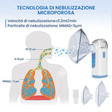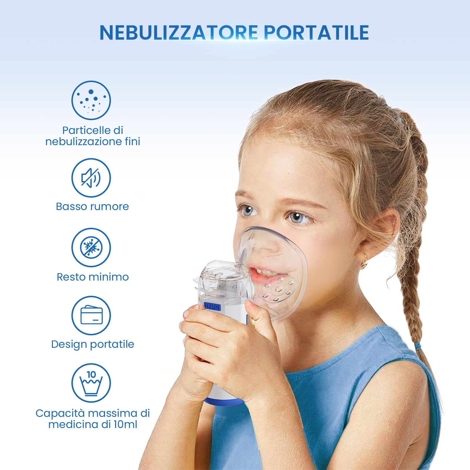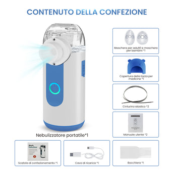 Questa nebulizzatrice ha modalità per adulti e bambini, con maschere specifiche per ciascuna fascia d'età, garantendo un dosaggio ottimale per ogni individuo. La funzione di auto-pulizia riduce il tempo di manutenzione e può essere utilizzata sia con maschere che con boccagli.