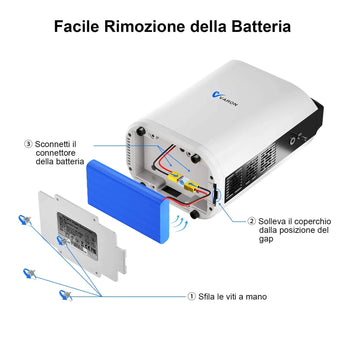Sì, l'VP-1 è dotato di una batteria ricaricabile integrata, facile da trasportare. Puoi collegare l'VP-1 a una fonte di alimentazione CA/CC con un cavo di alimentazione appropriato per la ricarica. Se l'apparecchio è in uso, il tempo di ricarica della batteria sarà più lungo.