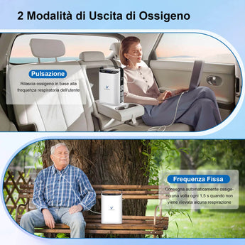 La fornitura di ossigeno è migliorata durante l'inalazione, la modalità di riserva sicura (rilascio di ossigeno ogni 3 secondi) durante l'inalazione e la modalità super-pulso (6 gradi) per aumentare la fornitura di ossigeno. Pesa solo 6,5 libbre e include batterie ricaricabili, caricabatterie a bordo e borse portatili per essere portato in viaggio, all'aperto e altro ancora.